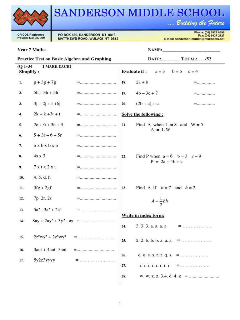 Algebra Worksheets Year 7 / Printable Worksheets Algebraic Expressions 7th Cbse Math ... - Our primary math algebra worksheets for math grade 6 cover:. Math worksheets and online activities. Features seventh grade math topics. There are a range of different algebra worksheets, including generating expressions, solving simple equations and calculating values. Some of the worksheets displayed are grade 7 math practice test, decimals work, math resource studio, fun math game s, grade 7 pre algebra end of the year test, math mammoth end of the year test grade 7 answer key, 501 math word. Use these free worksheets to help you study and do your homework.